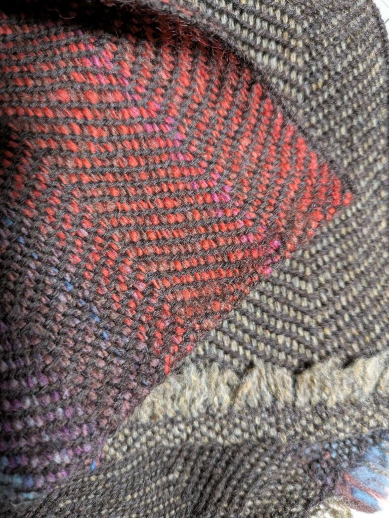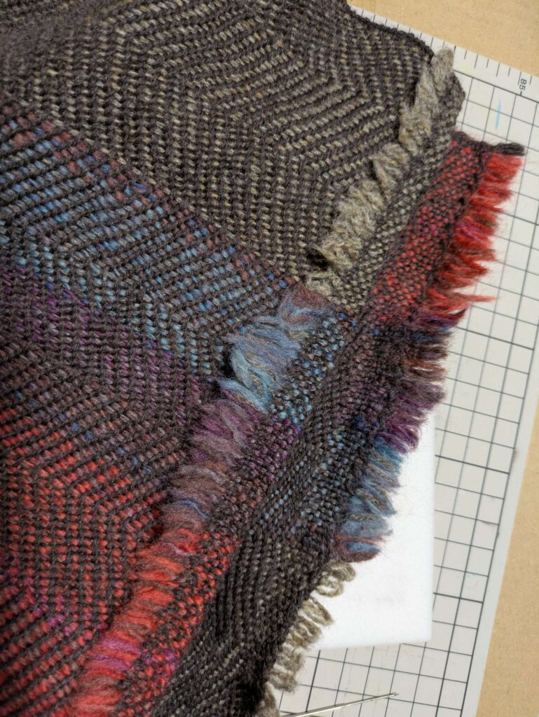 端の処理を悩みまして、そのまま三つ折りだと分厚いなーと。あぁでも羊毛やしってことでフェルト用のニードルでグサグサしまして